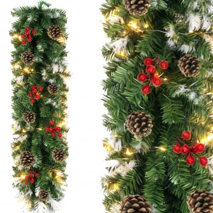 Girlanda została wykonana z najwyższej jakości folii PCV. Idealna dekoracja na balustradę lub balkon. Dostępna w różnych długościach, produkty można ze sobą łączyć i dowolnie modelować według własnego uznania. Łańcuch posiada ozdobne szyszki przyklejone na stałe do gałązek. Ilość gałązek to 106, składające się z różnych modeli: świerk pe, sosna oszroniona, sosnowe, świerkowe, sosna z szyszką i gałązki ostrokrzewu. Szerokość girlandy zależy od sposobu wymodelowania gałązek. Jest to produkt wieloletni, typu PREMIUM.