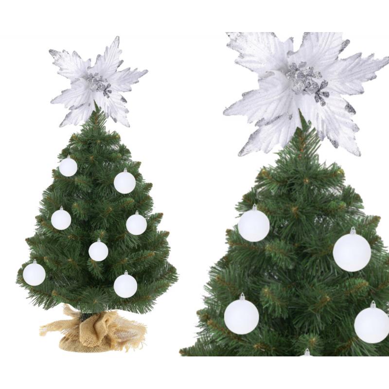 Ta kompaktowa choinka o wysokości 50 cm to idealne rozwiązanie do domu, biura lub na prezent. Wykonana z gęstych, realistycznych gałązek, ozdobiona białymi bombkami oraz białą gwiazdą betlejemską , tworzy przytulny świąteczny klimat w każdej przestrzeni.